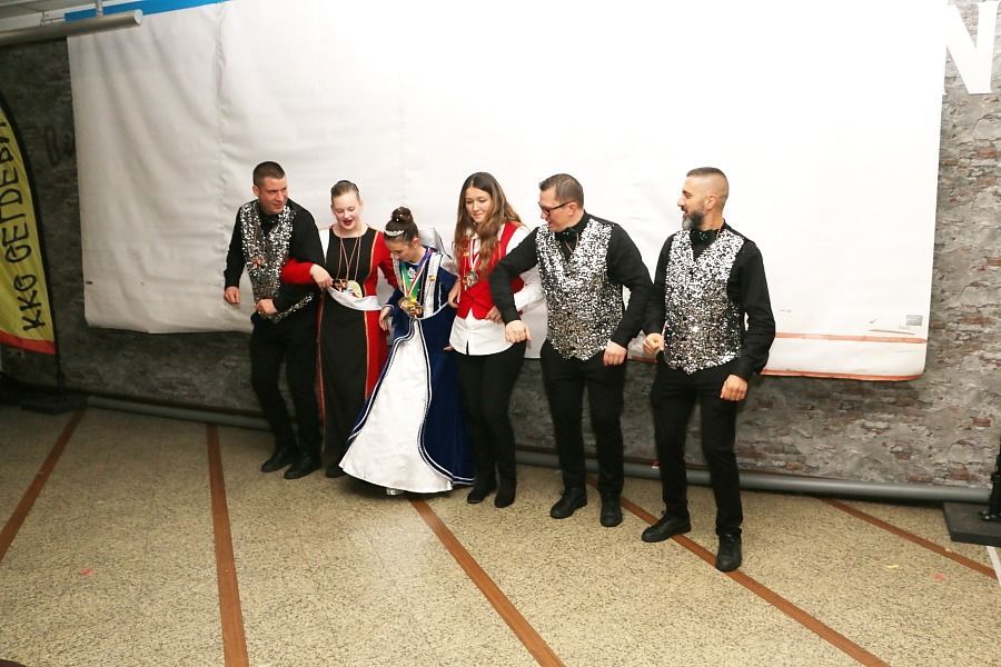 Mit dem Partyhit von Isi Glück „Wir sind alle da“ zog die älteste Tanzgruppe die Sisters ein, die dicht gefolgt wurde von der Garde der ersten Erwachsenentollität der KKG Geldern, die Mini-Cocktailfläschen getreu dem Sessionsmotto “Thekenzauber trifft auf Tanzfieber“ verteilten mit der zu inthronisierenden Erwachsenenprinzessin Nadine I. (Friemel). Sie ist ein Eigengewächs der KKG Geldern, die seit 26 Jahren Mitglied des Vereins ist und als Kinderprinzessin 1999/2000 mit Pierre Zick als Kinderprinz in Kooperation mit dem Bergknappenverein „Glück Auf“ Geldern und den Karnevalisten durch die Milleniumssession führte. In Nadine I. schlummerte immer schon der Wunsch in ihr einmal Erwachsenenprinzessin zu sein und so konnte der Verein ihr den Wunsch in der Jubiläumssession erfüllen.
