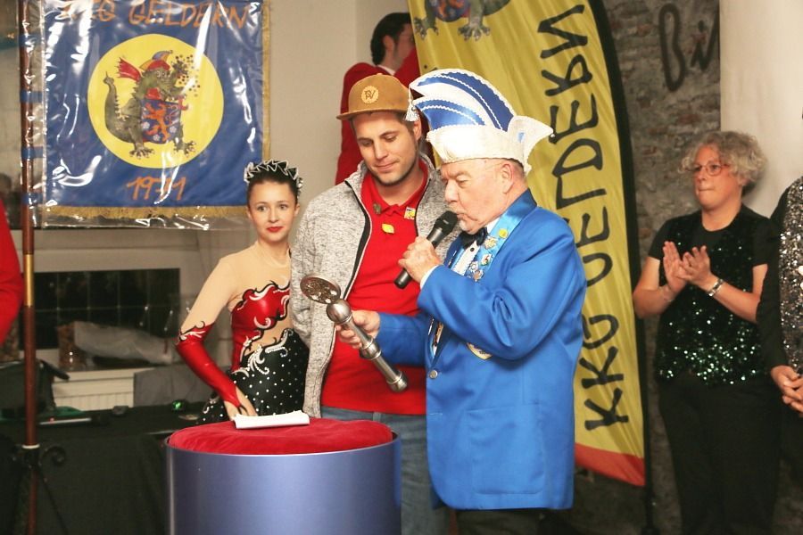 Sichtlich gerührt übernahm Nadine I. das brandneue einzigartige Zepter, welches vom Vereinsmitglied Chris Brückner angefertigt wurde und den Gelderner Löwen mit den 3 Mispelblüten zeigt. Die neue Erwachsenenprinzessin richtete Dankesworte an ihren Laudator und ihre Eltern, die sie genau wie in der Milleniumssession auch jetzt unterstützen werden. Sie stellte ihre 8köpfige Garde, der Cocktail Royals, 6 Herren und 2 Damen vor, die auch langjährige Wegbegleiter sind. Nadine I. machte auch ganz deutlich klar, dass sie viele gemeinsame Termine mit Pauline I. und ihrer Pagin Mia haben wird, auf die sich schon sehr freuen wird; es aber auch getrennte Auftritte gibt.