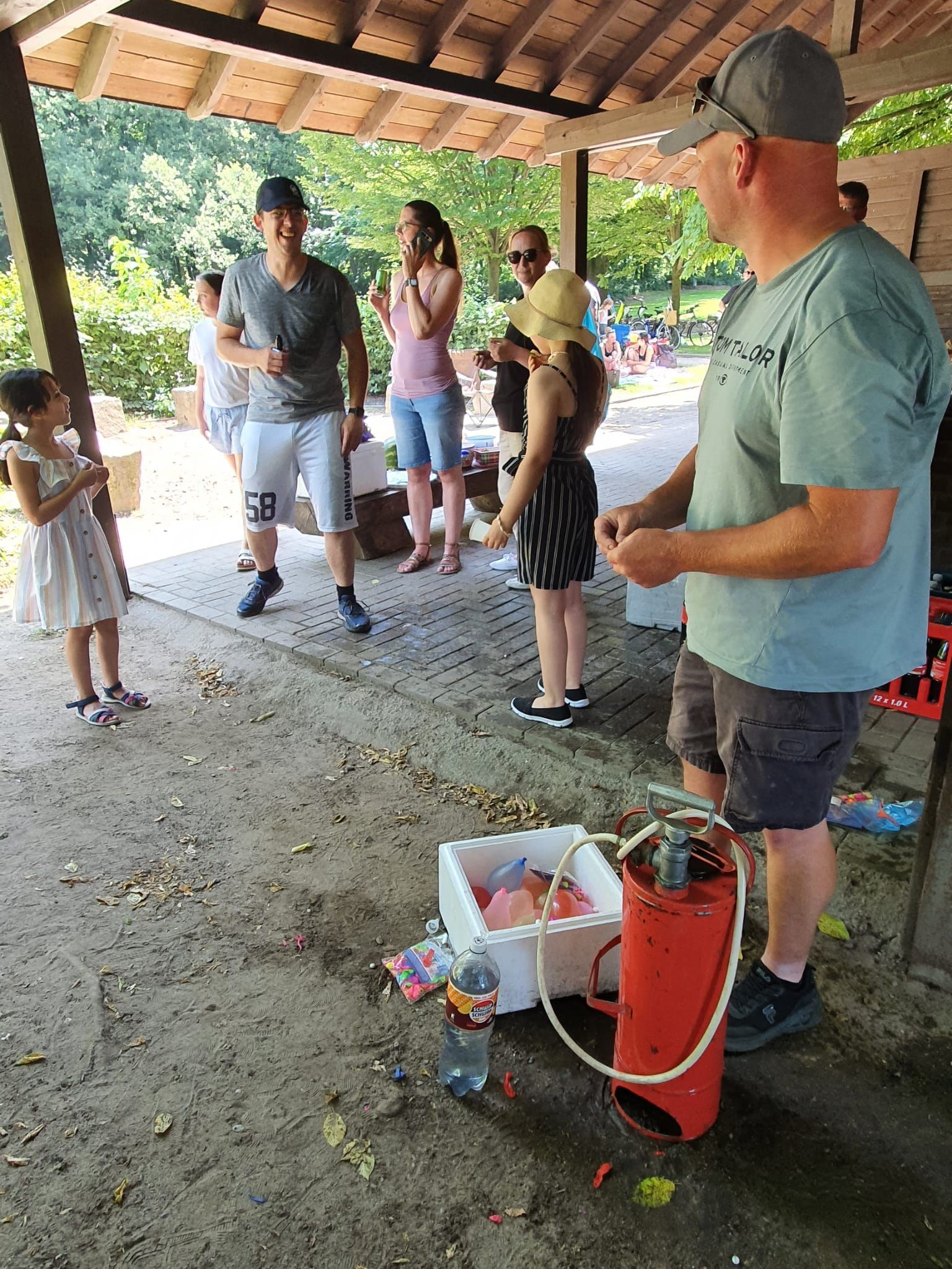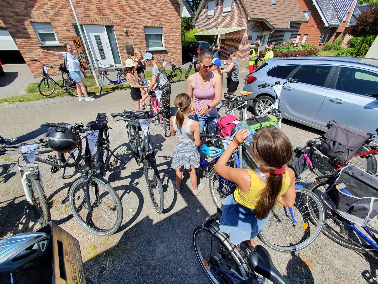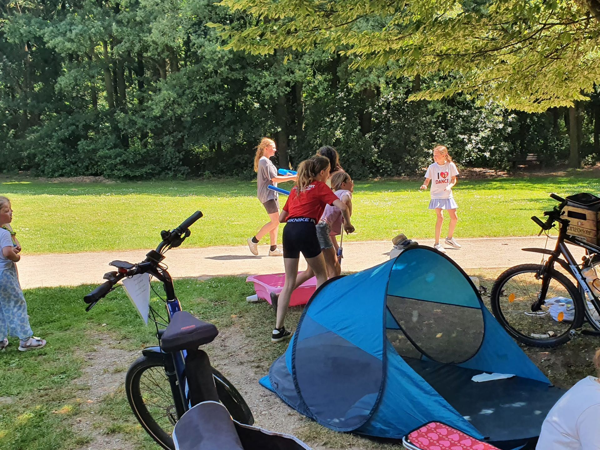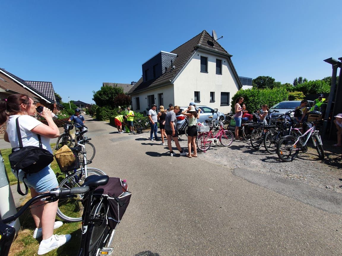 Auch in diesem Jahr haben wir das natürlich mit einer ganz besonderen Fahrradtour verbunden. Wir trafen uns um 11 Uhr am Marktplatz in Geldern, um dann gemeinsam zum Oermter Berg zu fahren; ein erfrischender Zwischenstopp erfolgte bei der amtierenden Kinderprinzessin Zoey II. in Sevelen. Trotz sommerlichen Temperaturen traten wir kräftig in die Pedale und erreichten dann unser Ziel, den Oermter Berg. Rasch wurde das Begleitfahrzeug ausgeladen und unser Grillmeister – zufällig der 1. Vorsitzende – entfachte schnell das Grillfeuer, damit die ausgehungerte Truppe mit leckerem Grillgut versorgt werden konnte. Zudem erhielten wir noch einen alten Feuerlöscher, der zwar schnell mit Wasser gefüllt wurde, aber weniger, um Feuer zu löschen, sondern um die anwesenden Vereinsmitglieder runterzukühlen, dies gelang perfekt, nachdem noch rund 400 Wasserbomben eingesetzt wurden. Es blieb kaum ein Kleidungsstück der vereinseigenen Kinder oder Erwachsenen trocken, wobei die Sonne alles gab, dass alle wieder schnell trocken wurden. Alle Beteiligten hatten einen Riesenspaß. Es wurden Tränen gelacht und vorzüglich gegessen, denn neben dem Gegrillten, gab es viele verschiedene Beilagen, die perfekt das gemeinsame Grillen abrundeten. Nach einem erfolgreichen Sommerfest am Oermter Berg hieß es dann : Ab auf das Fahrrad und wieder nach Geldern radeln.